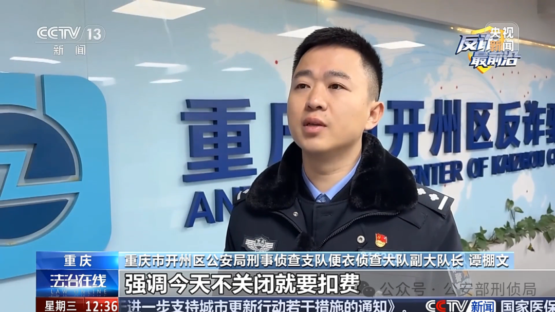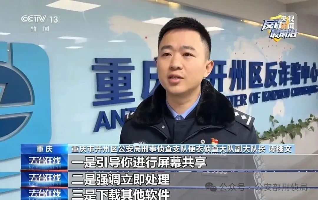 重庆市开州区公安局刑事侦查支队便衣侦查大队副大队长 谭棚文:骗子的话术虽然多变,但是始终围绕着以下逻辑,一是引导你进行“屏幕共享”,二是强调立即处理,不给核实机会,三是下载其他软件,脱离官方监管和保护。