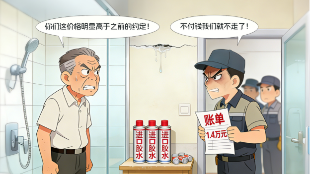 2022年3月,陈老伯因家中卫生间漏水,上网找了一家维修公司。正式施工前,维修队告知其根据预估需要7至10斤“正规进口胶水”,单价为每斤198元。陈老伯认为费用总价合理便同意施工。不料维修结束后,维修队的领队轩某却开出了1.4万元的“天价”账单。